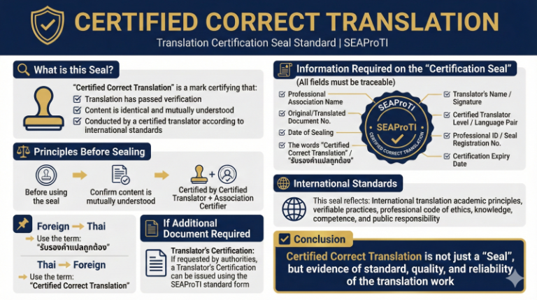 The Southeast Asian Association of Professional Translators and Interpreters (SEAProTI) has officially announced the criteria and qualifications for individuals to register as “Certified Translators,” “Translation Certification Providers,” and “Certified Interpreters” under the association’s regulations. These guidelines are detailed in Sections 9 and 10 of the Royal Thai Government Gazette, issued by the Secretariat of the Cabinet under the Office of the Prime Minister of the Kingdom of Thailand, dated July 25, 2024, Volume 141, Part 66 Ng, Page 100.