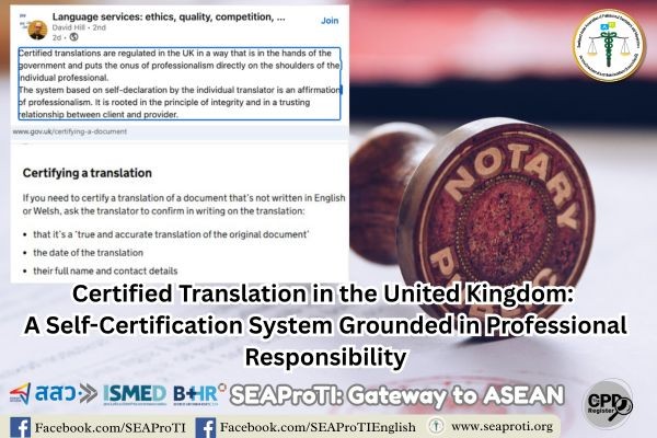 สมาคมวิชาชีพนักแปลและล่ามแห่งเอเชียตะวันออกเฉียงใต้ (SEAProTI) ได้ประกาศหลักเกณฑ์และคุณสมบัติผู้ที่ขึ้นทะเบียนเป็น “นักแปลรับรอง (Certified Translators) และผู้รับรองการแปล (Translation Certification Providers) และล่ามรับรอง (Certified Interpreters)” ของสมาคม หมวดที่ 9 และหมวดที่ 10 ในราชกิจจานุเบกษา ของสำนักเลขาธิการคณะรัฐมนตรี ในสำนักนายกรัฐมนตรี แห่งราชอาณาจักรไทย ลงวันที่ 25 ก.ค. 2567 เล่มที่ 141 ตอนที่ 66 ง หน้า 100 อ่านฉบับเต็มได้ที่: นักแปลรับรอง ผู้รับรองการแปล และล่ามรับรอง