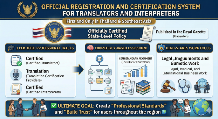 The Southeast Asian Association of Professional Translators and Interpreters (SEAProTI) has formally established criteria for the registration of “Certified Translators,” “Translation Certification Providers,” and “Certified Interpreters.” These provisions are codified under Chapters 9 and 10 of the Royal Gazette, published by the Secretariat of the Cabinet, Office of the Prime Minister of the Kingdom of Thailand, dated 25 July 2024, Vol. 141, Part 66 Ngor, p. 100. The Royal Thai Government Gazette