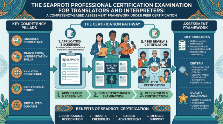 - SEAProTI. (2023). Professional standards for certified translators and interpreters in Southeast Asia. Bangkok: Southeast Asian Association of Professional Translators and Interpreters.